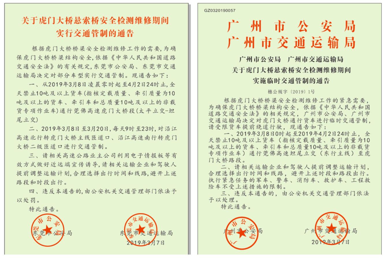 根據(jù)廣州市、東莞市兩地公安局和交通運(yùn)輸局通告,從2019年3月8日0時(shí)起至4月2日24時(shí)止,全天禁止10噸及以上貨車(指核定載質(zhì)量、牽引質(zhì)量為10噸及以上的貨車、牽引車和總質(zhì)量10噸及以上的非載貨專項(xiàng)作業(yè)車)通行莞佛高速虎門(mén)大橋段。