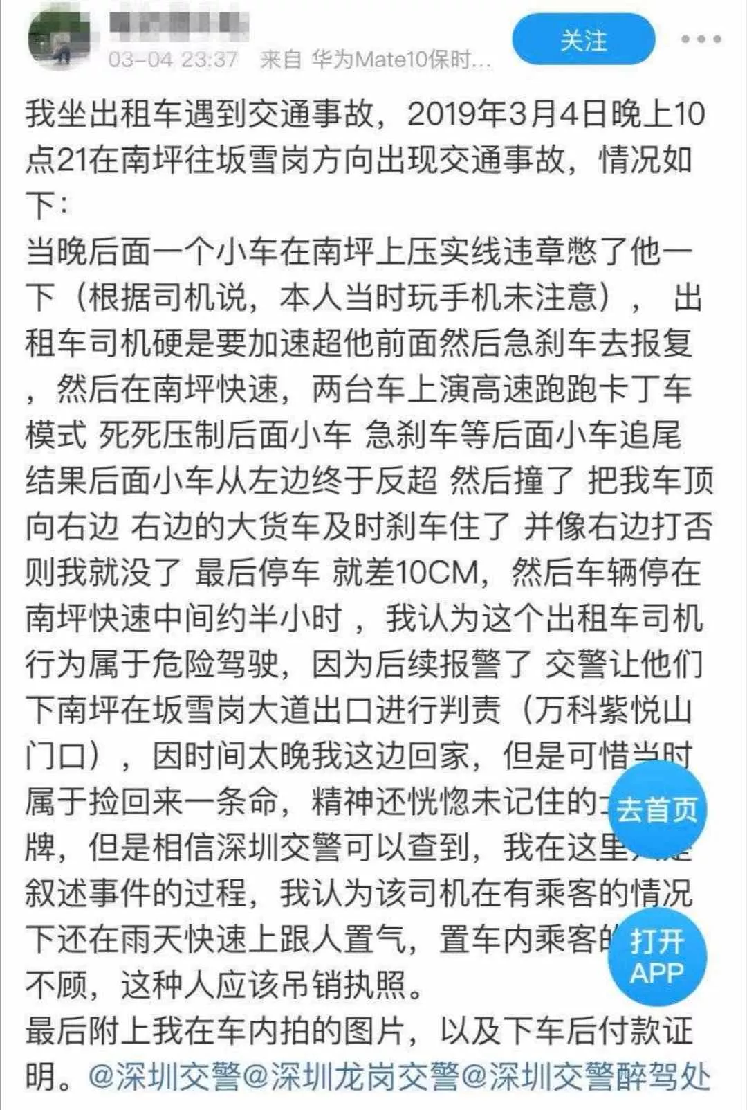 深廣電直播深圳2019年3月11日訊 近日有網(wǎng)友微博舉報(bào),3月4日晚其乘坐的一輛出租車(chē)與其他車(chē)斗氣引發(fā)交通事故,隨后深圳交警機(jī)動(dòng)訓(xùn)練大隊(duì)對(duì)雙方司機(jī)進(jìn)行調(diào)查。