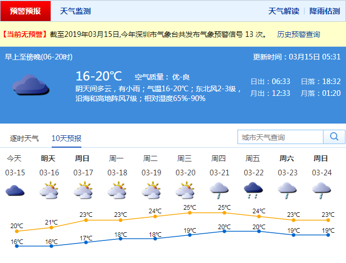 深圳新聞網(wǎng)2019年3月15日訊 太陽再次“流浪”?這次不會“流浪”太久,周末陽光又要來了!據(jù)深圳市氣象臺消息,今日深圳陰天為主,有小雨;氣溫16-19℃。早晨天氣較涼,注意添衣保暖;部分時間有小雨,外出最好帶把傘。