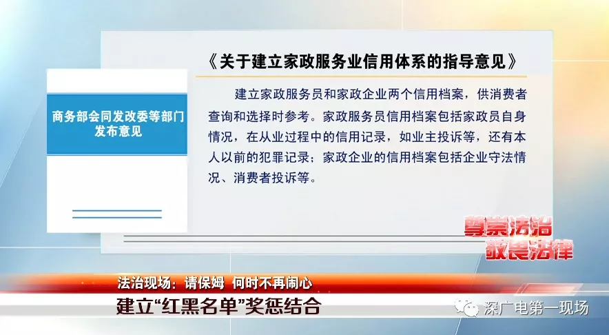 趙坤:在深圳,請(qǐng)保姆,育嬰師,鐘點(diǎn)工等等是很多家庭的剛需,但是很多人也抱怨說,要請(qǐng)個(gè)好的保姆阿姨實(shí)在是太難了,有些雇主因?yàn)楦鞣N原因家里來來去去換了好幾個(gè)阿姨,有些甚至還跟家政公司調(diào)解不成鬧上了法庭。防患于未然,商務(wù)部等部委這次發(fā)布的意見,建立信用檔案,可謂來的正當(dāng)時(shí)。我們也期待深圳能盡快出臺(tái)家政行業(yè)信用平臺(tái),期待深圳的家政行業(yè)能更加透明,更加規(guī)范。