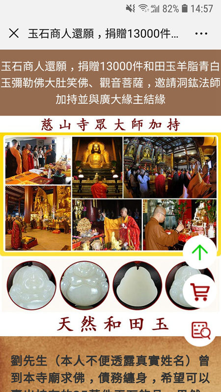 記者打開警方提供的網站鏈接,隨即便出現了香港某知名寺院的頁面,上面有不同的法師主持不同法事的照片。照片上方,赫然寫著"玉石商人還愿,捐贈13000件和田玉羊脂青白玉彌勒佛大肚笑佛、觀音菩薩,邀請 XX法師加持并與廣大緣主結緣"的字樣。接下來網頁上便講述了一個漏洞百出、文理不通的"傳奇故事"——
