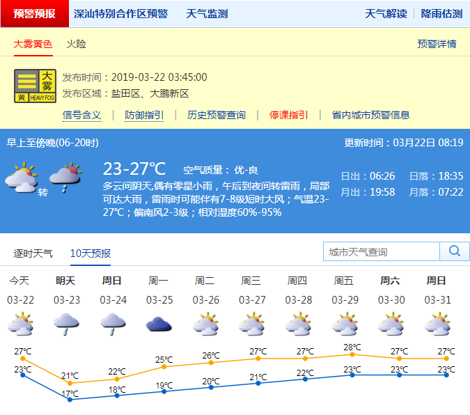 深圳新聞網(wǎng)2019年3月22日訊 記者從深圳市氣象局獲悉,今日白天轉(zhuǎn)陣雨或雷雨,局部可達大雨,并可能伴有7-8級短時大風;23-24日云量較多伴有小雨,氣溫下降5-6℃,天氣轉(zhuǎn)涼;25日轉(zhuǎn)多云,氣溫回升。