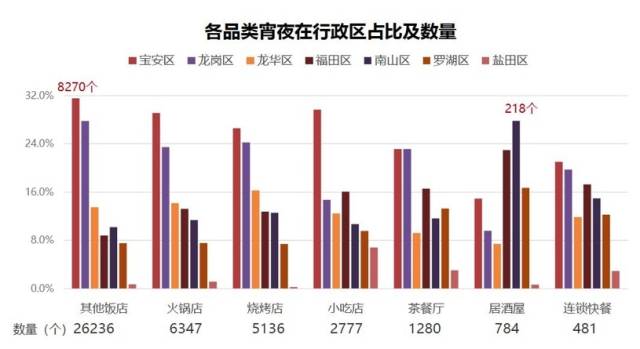 寶安、龍崗傳統(tǒng)夜宵居多,而居酒屋這類新型夜宵聚集在福田、南山。