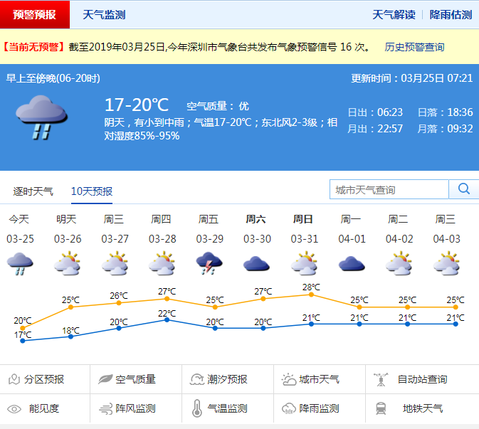 深圳新聞網(wǎng)2019年3月25日訊 今日仍陰涼有雨,降雨主要出現(xiàn)在凌晨至午后,有小雨到中雨,局部大雨,可能有零散雷暴。深圳市氣象局預計26日起轉多云可見陽光,氣溫逐日回升,27-28日暖濕有霧,最高氣溫可回升至25℃以上。