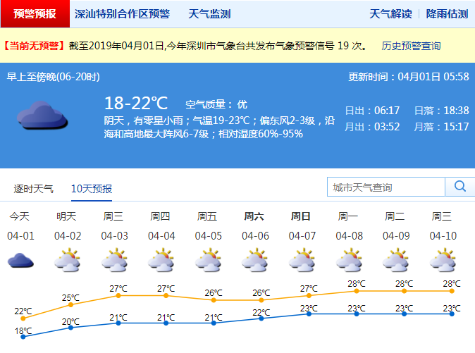 深圳新聞網(wǎng)2019年4月1日訊 今日深圳陰天,有分散小雨;受冷空氣影響,氣溫下降,天氣稍涼,氣溫18-22℃;偏東風(fēng)3級(jí),沿海和高地最大陣風(fēng)7級(jí);相對(duì)濕度65%-95%。4月2日至清明假期多云為主,間有陣雨和輕霧,氣溫逐漸回升。
