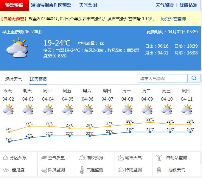 深圳新聞網(wǎng)2019年4月2日訊 近兩天,深圳天氣稍微轉涼,偶有分散小雨。預計今日起可見陽光,氣溫逐日回升。3日多云,可見陽光,間中有陣雨和輕霧,氣溫逐日回升。其中,今日氣溫20 ℃至25 ℃,3日氣溫21 ℃至27 ℃;4日和清明假期多云,可見陽光,間中有陣雨和輕霧。