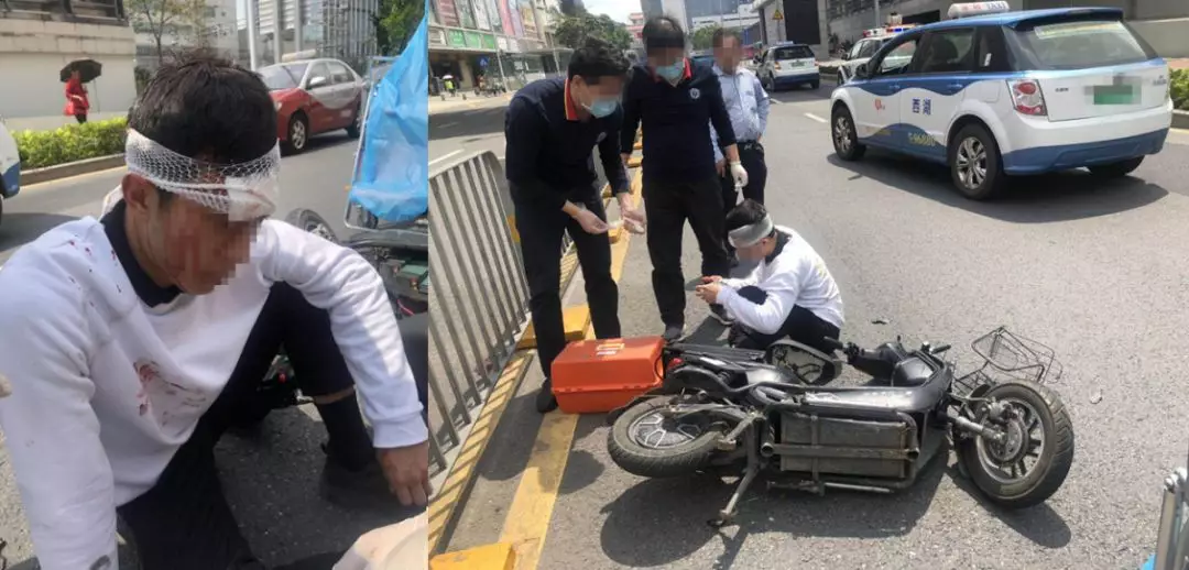 由反向橫穿馬路而來的電動(dòng)車與曾某駕駛的出租車發(fā)生碰撞,電動(dòng)車應(yīng)聲倒地,駕駛員吳某頭部受傷,流血不止,電動(dòng)車受損嚴(yán)重!