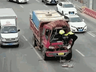 滾滾車(chē)流中,一輛車(chē)頭被撞凹的貨車(chē),兩個(gè)爬上車(chē)頭的鐵騎,這是在做什么?