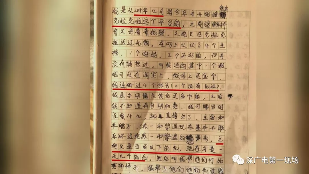 洋洋的媽媽說,發(fā)現(xiàn)自己的女兒刷掉了200萬,就要求女兒寫了一份檢討書。洋洋在檢討書上說,除了平時(shí)在平臺(tái)上進(jìn)行互動(dòng),主播還跟自己加了微信好友,平時(shí)對(duì)自己特別關(guān)心,聊天的內(nèi)容好像關(guān)系很密切,說的話也都推心置腹一般,其中一個(gè)主播還說了,要和洋洋共同自殘?!