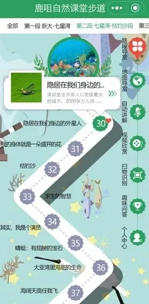 隨著綠道行進(jìn)的深入,記者來到第一個自然觀察研習(xí)點,這里配置有自然研習(xí)導(dǎo)賞標(biāo)識牌,牌上有植物動物的照片及介紹,牌子的角落有供游客學(xué)習(xí)的二維碼。記者了解到,新區(qū)同時開發(fā)建立一套APP自然課堂學(xué)習(xí)系統(tǒng),在綠道全程配套建設(shè)64個實地自然觀察研習(xí)點,設(shè)置了260余個自然研習(xí)導(dǎo)賞標(biāo)識,接入專業(yè)智能識別軟件,配以體量龐大生物影像數(shù)據(jù)庫。掃碼進(jìn)入APP就可以通過文字、圖片和音像資料了解到“大鹿線”全景介紹和分區(qū)介紹,以及物種相關(guān)知識。同時,該系統(tǒng)利用手機GPS定位技術(shù),為行進(jìn)中的市民游客自動講解所到之處的自然課堂語音課程。來自羅湖的資深驢友李先生告訴記者,來“大鹿線”徒步,不僅鍛煉身體愉悅心情,還可以學(xué)到豐富的自然知識,打開APP行走全程,猶如參觀了一座多維一體的山?!叭安┪镳^”。