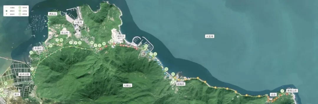 大鵬新區(qū)根據(jù)線路的地形、山海景觀、人文景觀的分布,確定了“打造‘兩線、三段、五大節(jié)點’的濱海生態(tài)自然課堂步道”。據(jù)新區(qū)建筑工務局負責人介紹,從新大河入海口到大亞灣海岸鹿咀懸崖,全長18.7公里的海岸線上分布著河流、山林、海灘、溪流、濕地等多樣生態(tài)系統(tǒng)。2017年7月,大鵬新區(qū)按照濱海慢行系統(tǒng)示范工程標準,動工建設新大-鹿嘴市政綠道?!皟删€”指的是沿著海岸的濱海徒步路線和城市二號綠道線,兩條線之間的6.6平方公里土地將形成一座開放的郊野公園;“三段”分別為活力生活段、自然生態(tài)段和休閑旅游段;“五大節(jié)點”為山海綠畔、古廟遺風、東山凹、愛情灘、鹿咀山莊等自然景觀。