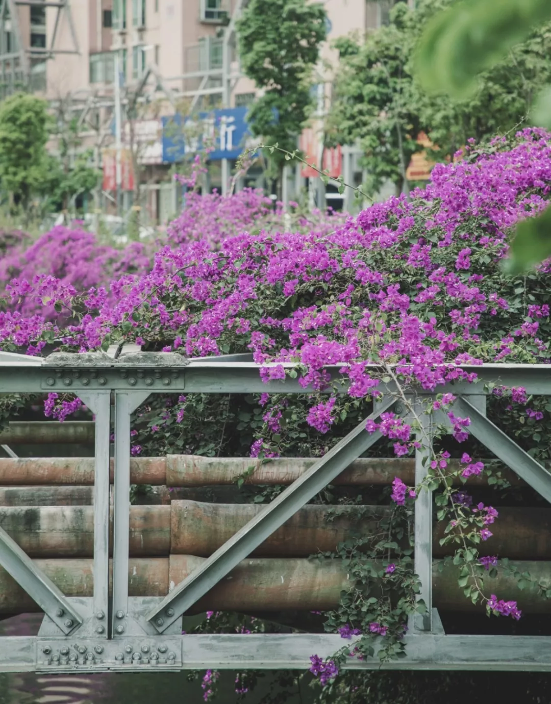 經(jīng)過寶安人不懈的努力,西鄉(xiāng)河已不見了黑臭的身影,此時(shí)盛開的紅色、紫色勒杜鵑清晰地倒映在河面上。