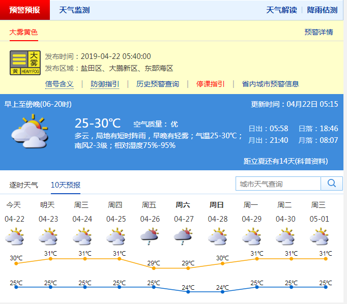 深圳市氣象局預(yù)計22-25日多云為主,局地有短時陣雨;展望下周后期天氣不穩(wěn)定,轉(zhuǎn)多陣雨,26-28日有陣雨或雷陣雨,部分時間雨勢較大。