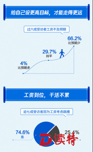 報(bào)告顯示,受經(jīng)濟(jì)環(huán)境等因素影響,過(guò)六成受訪者工資不及預(yù)期,同時(shí),工資水平影響了職場(chǎng)人的職業(yè)規(guī)劃,逾七成受訪者因?yàn)楣べY考慮跳槽;66.2%的受訪者工資水平比預(yù)期少,只有4%的受訪者認(rèn)為工資比預(yù)期多,此外,逾七成受訪者認(rèn)為工資是考慮跳槽的主要因素。