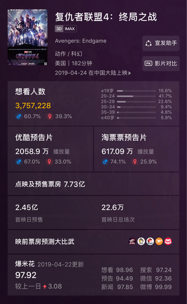 深圳新聞網(wǎng)4月24日訊(記者 陳婕)相信你的朋友圈已經(jīng)被“復(fù)聯(lián)4”占據(jù)了領(lǐng)地,而小記認(rèn)識的英雄還湊不齊一桌麻將。截至24日00點,《復(fù)仇者聯(lián)盟4》預(yù)售已破7億!超《美國隊長2》總票房,在《復(fù)聯(lián)4》的預(yù)售峰值期,淘票票預(yù)售市場占比過半。