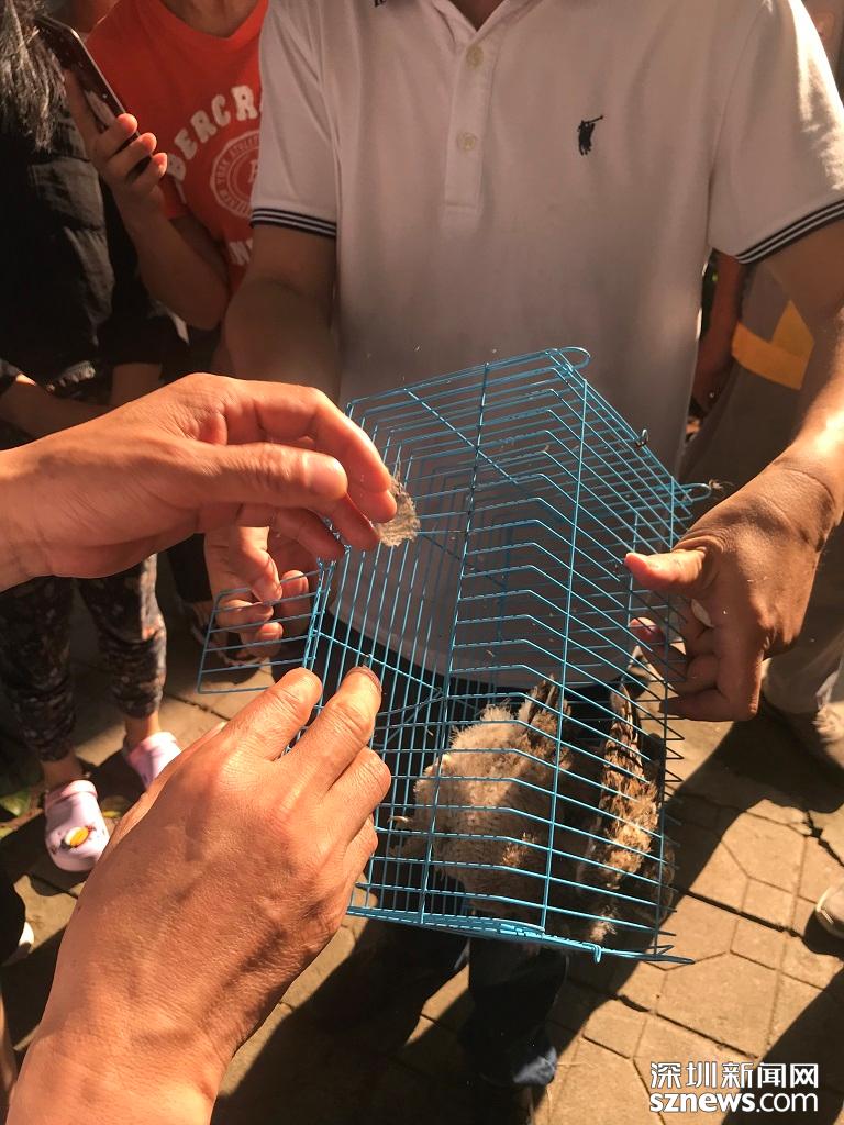 小區(qū)保安先把小貓頭鷹裝進(jìn)籠子,等待動(dòng)保所的工作人員到來(lái)。深圳新聞網(wǎng)記者 施翔東 攝
