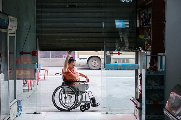初見彭水林,他肚臍以下已全部截去,兩根直接連接腎臟的軟管用來排尿,大便排泄則通過人造肛門完成。令人不敢相信的是,這樣的他,能夠熟練地拉開位于在長(zhǎng)沙城東芙蓉區(qū)“沁園”小區(qū)岔路口——“半截人便利店”的那道厚重的卷閘門。卷閘門徐徐升起,三世同堂的他抱著孫女,就這樣開始了一天的工作。
