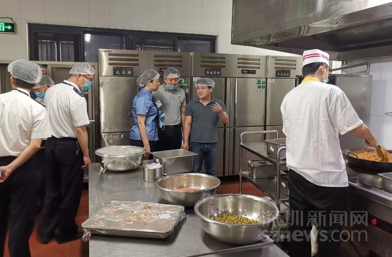 聯(lián)合檢查組工作人員對深圳學(xué)校食堂進(jìn)行檢查(深圳人民市檢察院供圖)
