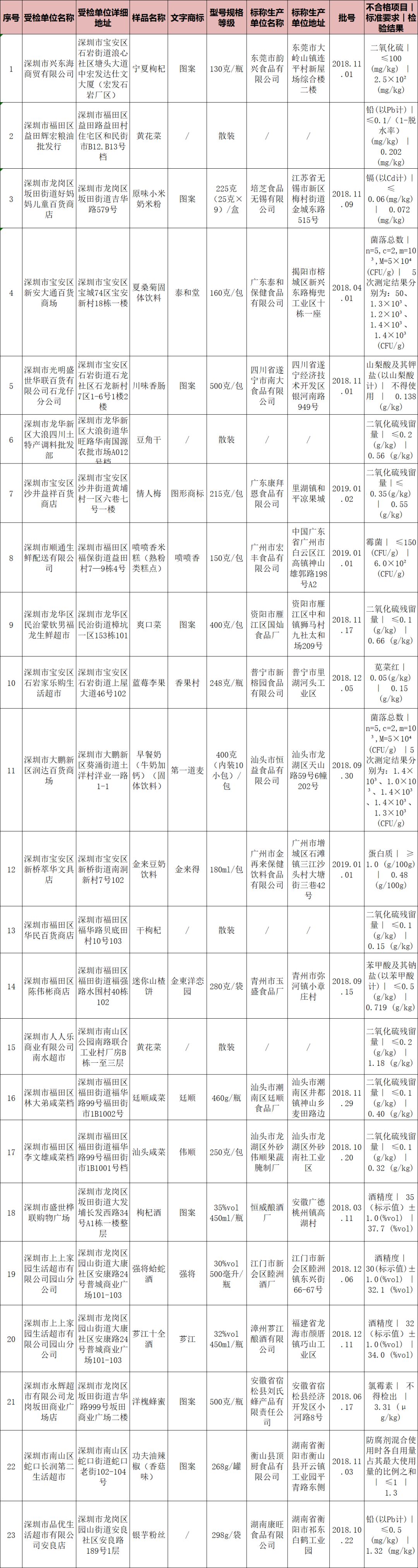 本次共抽檢流通環(huán)節(jié)食品2131批次,涉及流通環(huán)節(jié)經(jīng)營(yíng)主體529家次,共檢測(cè)食品指標(biāo)13373項(xiàng)次。其中檢出不合格樣品23批次,涉及不合格食品類別有茶葉及相關(guān)制品1批次,淀粉及淀粉制品1批次,蜂產(chǎn)品1批次,糕點(diǎn)1批次,酒類3批次,肉制品1批次,蔬菜制品6批次,水果制品4批次,特殊膳食食品1批次,調(diào)味品1批次,飲料3批次;涉及不合格項(xiàng)目類別為獸藥殘留、金屬等元素污染、微生物污染、食品添加劑、品質(zhì)指標(biāo)。