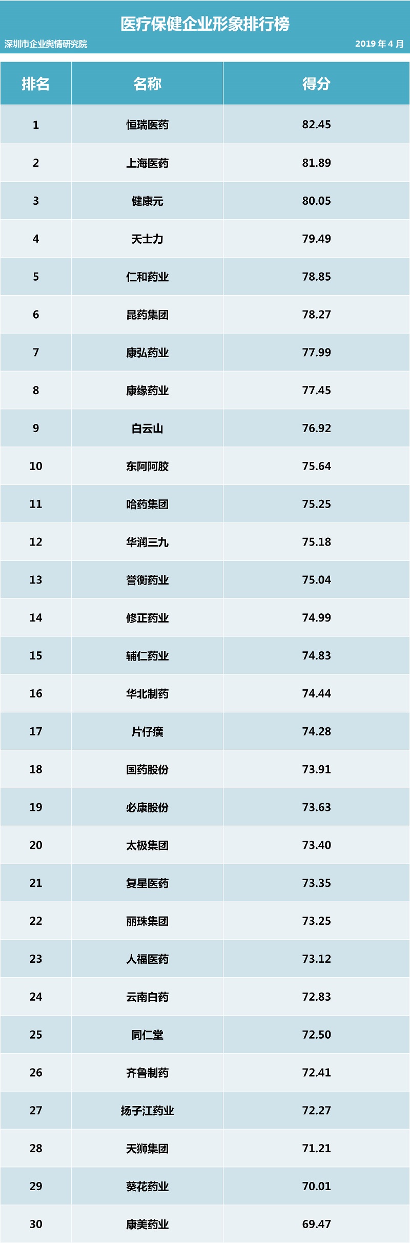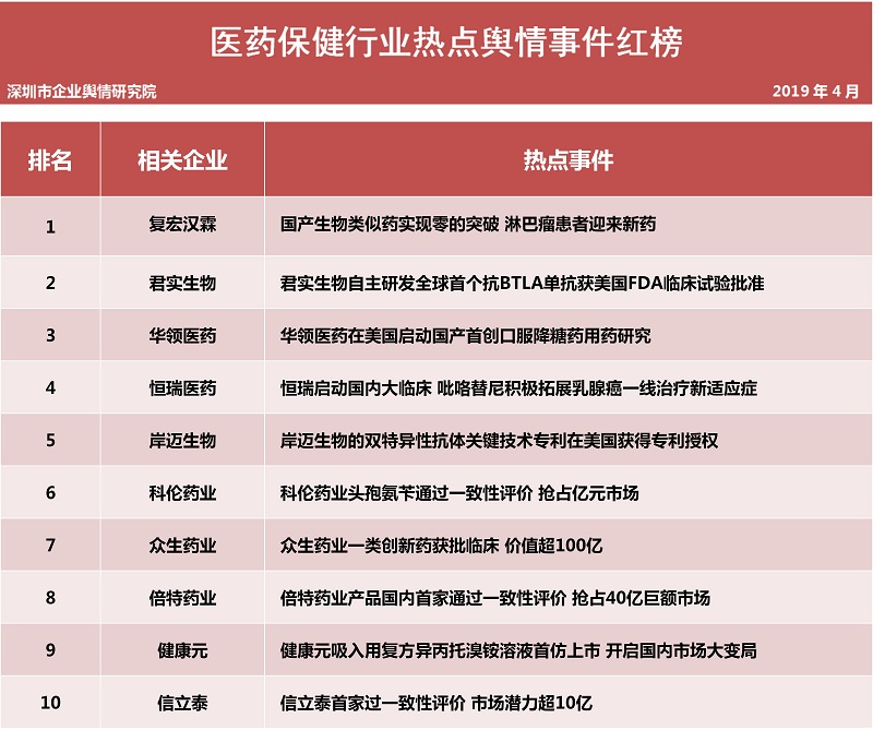 深圳新聞網(wǎng)2019年5月7日訊 (記者田志強(qiáng) 通訊員陳文光)5月7日,深圳企業(yè)輿情研究院發(fā)布第十四批企業(yè)輿情榜單。本次榜單重點聚焦房地產(chǎn)及醫(yī)藥保健兩個行業(yè)。醫(yī)藥保健行業(yè)輿情榜單由醫(yī)療保健行業(yè)熱點輿情事件排行榜(紅、黑榜)及醫(yī)藥保健行業(yè)企業(yè)公眾形象排行榜組成。