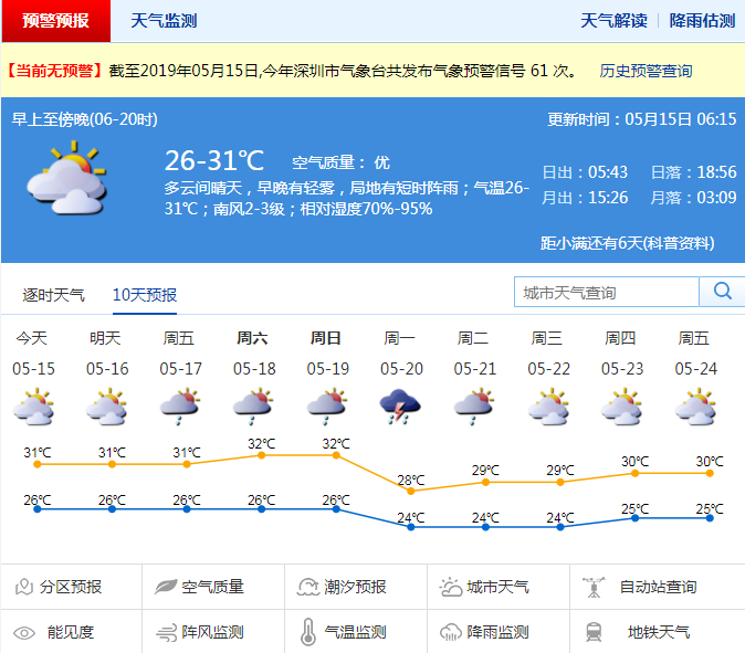預(yù)計未來幾天持續(xù)炎熱,其中,15日深圳以多云天氣為主,局地有短時陣雨,早晚有輕霧,氣溫26℃至31℃;16日至19日持續(xù)炎熱,最高氣溫達(dá)32℃,以多云為主,局地有陣雨或雷陣雨;20日前后將有一次明顯降雨過程。