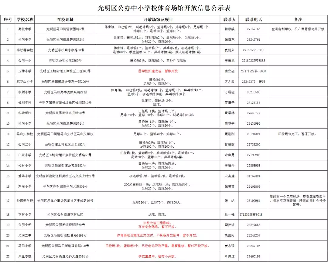 注意:光明區(qū)高級(jí)中學(xué)、光明中學(xué)是全寄宿制學(xué)校,學(xué)校體育場(chǎng)館設(shè)施只在寒暑假對(duì)外開(kāi)放