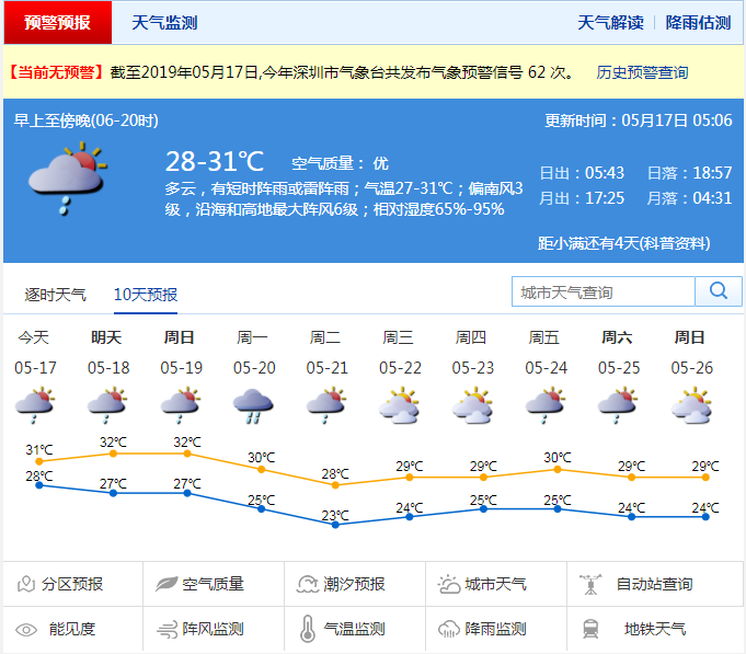 深圳新聞網(wǎng)2019年5月17日訊 近幾日深圳天氣悶熱,17日白天氣溫在28~31℃之間,預(yù)計18~19日深圳多局地性短時(雷)陣雨,天氣悶熱,20日有一次中到大雨局部暴雨的降雨過程。據(jù)悉,深圳將進入龍舟水強降水集中期,預(yù)計今年深圳龍舟水偏重。