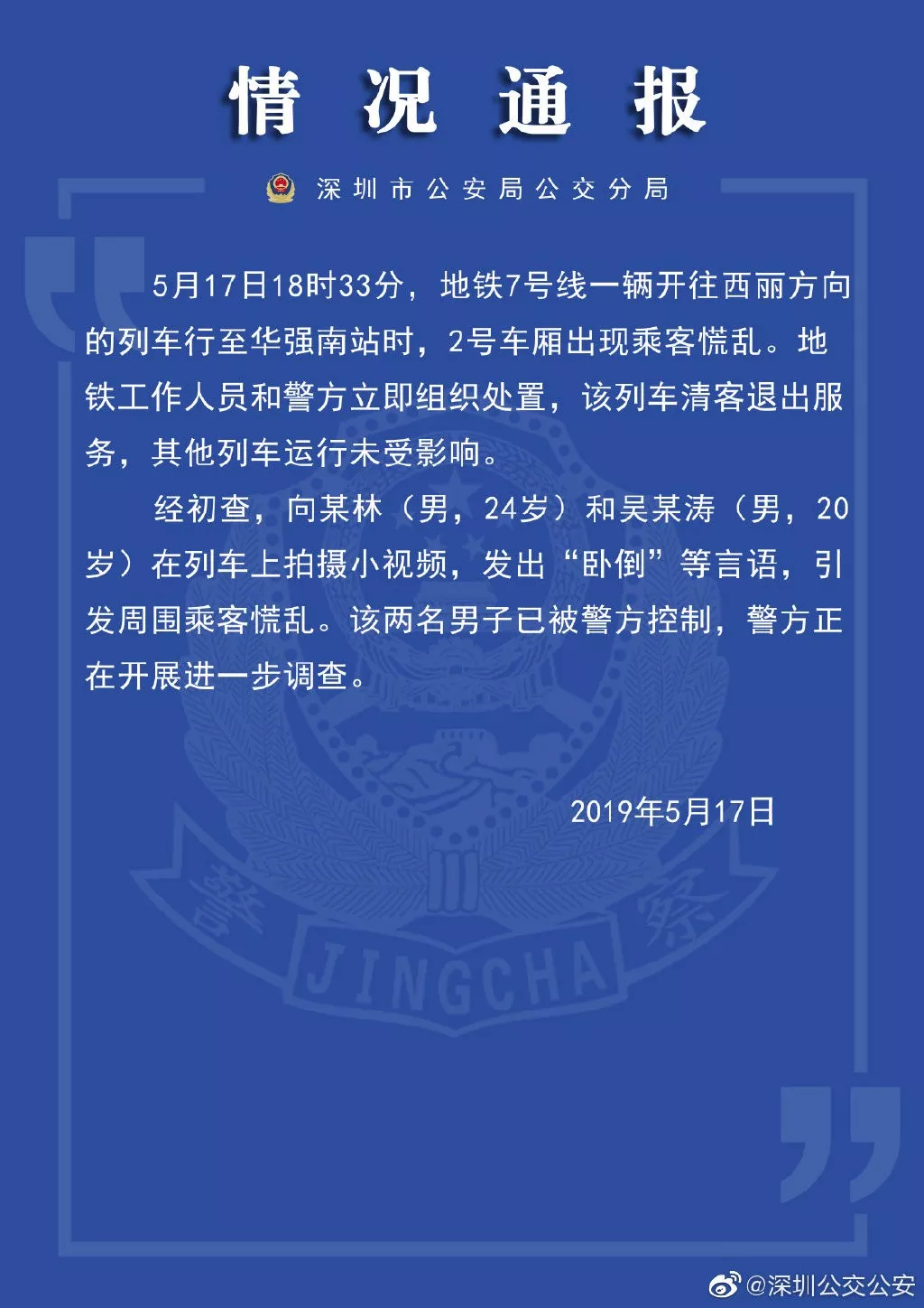 據(jù)深圳公交公安介紹,5月17日18時33分,地鐵7號線一輛開往西麗方向的列車行至華強南站時,2號車廂出現(xiàn)乘客慌亂。地鐵工作人員和警方立即組織處置,該列車清客退出服務(wù),其他列車運行未受影響。