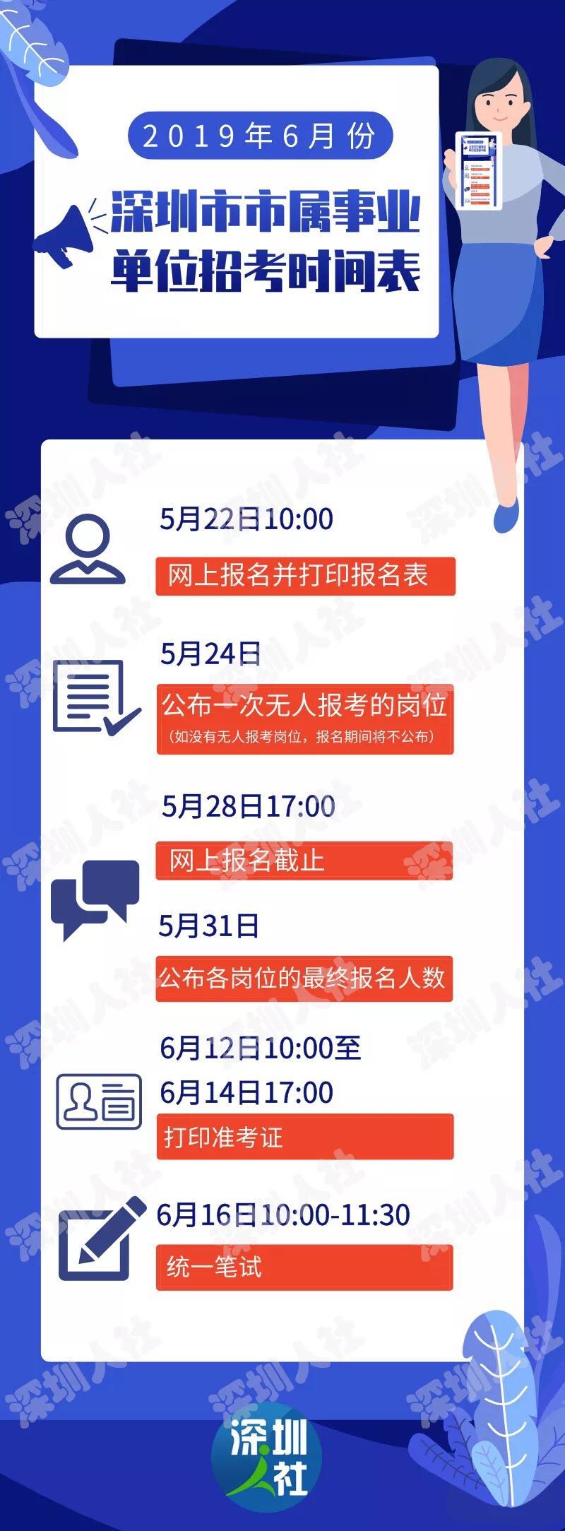 本次采取網(wǎng)上報名的方式,報名時間為5月22日10:00至5月28日17:00,具體報名程序和方法可登錄深圳市人力資源和社會保障局網(wǎng)站深圳市考試院專欄http://hrss.sz.gov.cn/szksy/查詢。報名成功后打印報名表;5月24日將公布一次無人報考的崗位(如沒有無人報考崗位,報名期間將不公布),5月31日將公布各崗位的最終報名人數(shù)。