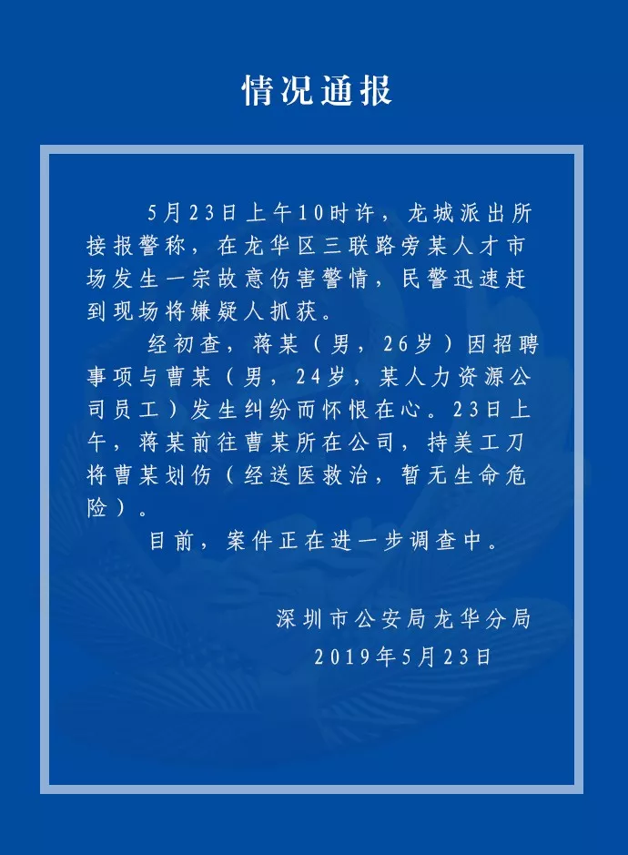 據(jù)警方通報,嫌疑人蔣某因招聘事項與某人力資源公司員工曹某發(fā)生糾紛,懷恨在心。23日上午,蔣某前往曹某所在公司,持美工刀將曹某劃傷。經(jīng)送醫(yī)救治,暫無生命危險,目前案件進一步調查當中。