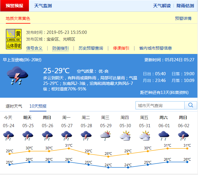 深圳新聞網(wǎng)2019年5月24日訊 昨日,光明區(qū)和寶安北部等出現(xiàn)了暴雨局地大暴雨。市氣象臺預測,今日局部仍有暴雨,并伴有雷暴,市民外出注意采取相應防御措施。