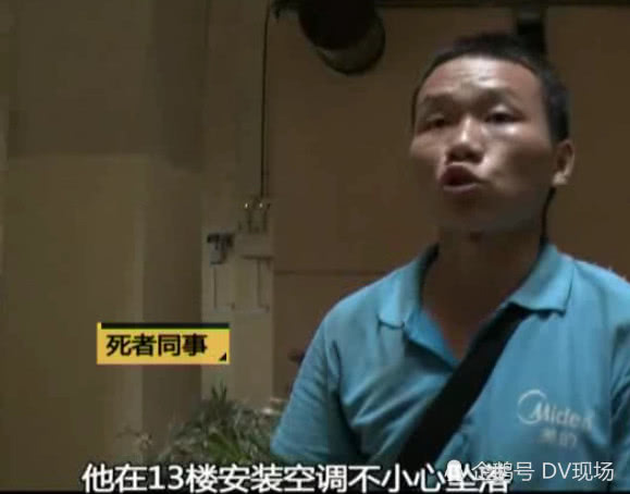 從拍攝的視頻可以看到,死者當(dāng)時是穿著有"美的公司"公司字樣的衣服,目擊者說,死者是在13樓安裝空調(diào)外機(jī)時出事的。
