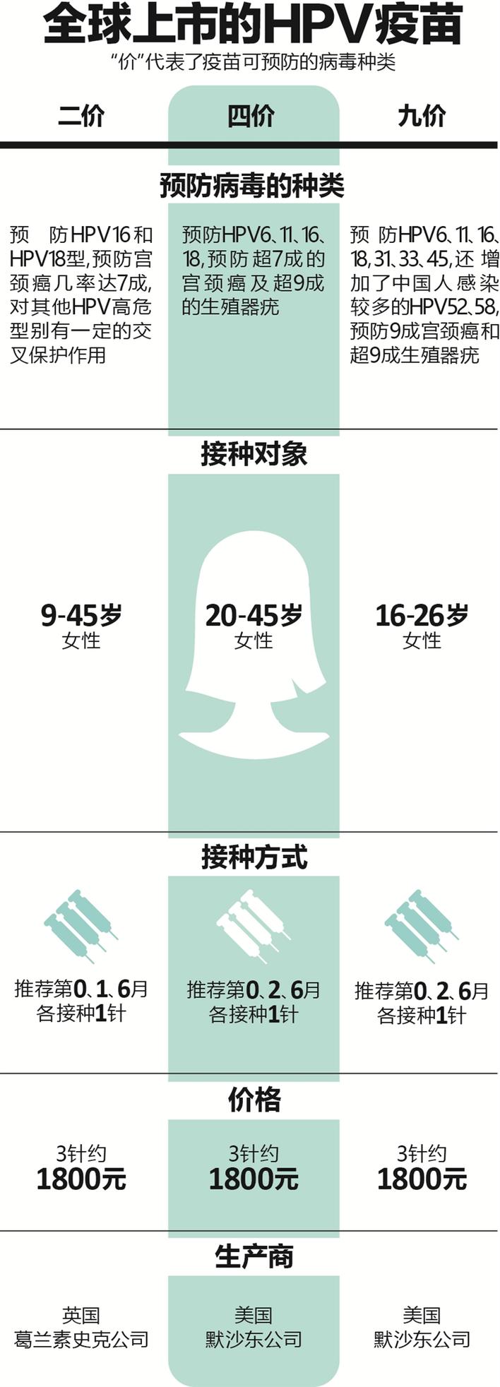目前,國際上廣泛使用的 HPV疫苗有3種,分別為二價、四價、九價HPV。深圳每針HPV九價疫苗的價格為1323元,加上每針25元的注射費,三針下來總花費在4000出頭。不過與香港HPV九價疫苗規(guī)定“9歲或以上之女性及男性(沒年齡上限)”均可接種不同,深圳HPV九價疫苗的搖號年齡限定為16-26.5歲的女性。據了解,在理想情況下,疫苗應該在首次性行為(即暴露于HPV感染危險)之前給予。年齡越大的女性因有性行為增大了HPV病毒感染的幾率,而HPV疫苗對于已感染的HPV病毒無治療作用,只能預防未感染的HPV病毒,因此疫苗免疫會比未感染病毒的女性低。