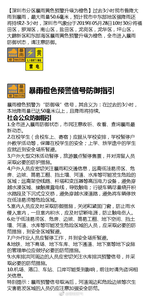 【深圳市分區(qū)暴雨黃色預(yù)警升級為橙色】過去3小時我市普降大雨到暴雨,最大雨量50.6毫米,預(yù)計我市中東部地區(qū)強降雨還將持續(xù)2-3小時,深圳市氣象臺于2019年05月28日10時30分將福田區(qū),羅湖區(qū),南山區(qū),鹽田區(qū),龍崗區(qū),龍華區(qū),坪山區(qū),大鵬新區(qū)和東部海區(qū)暴雨黃色預(yù)警升級為橙色,全市進(jìn)入暴雨防御狀態(tài),請注意防御。