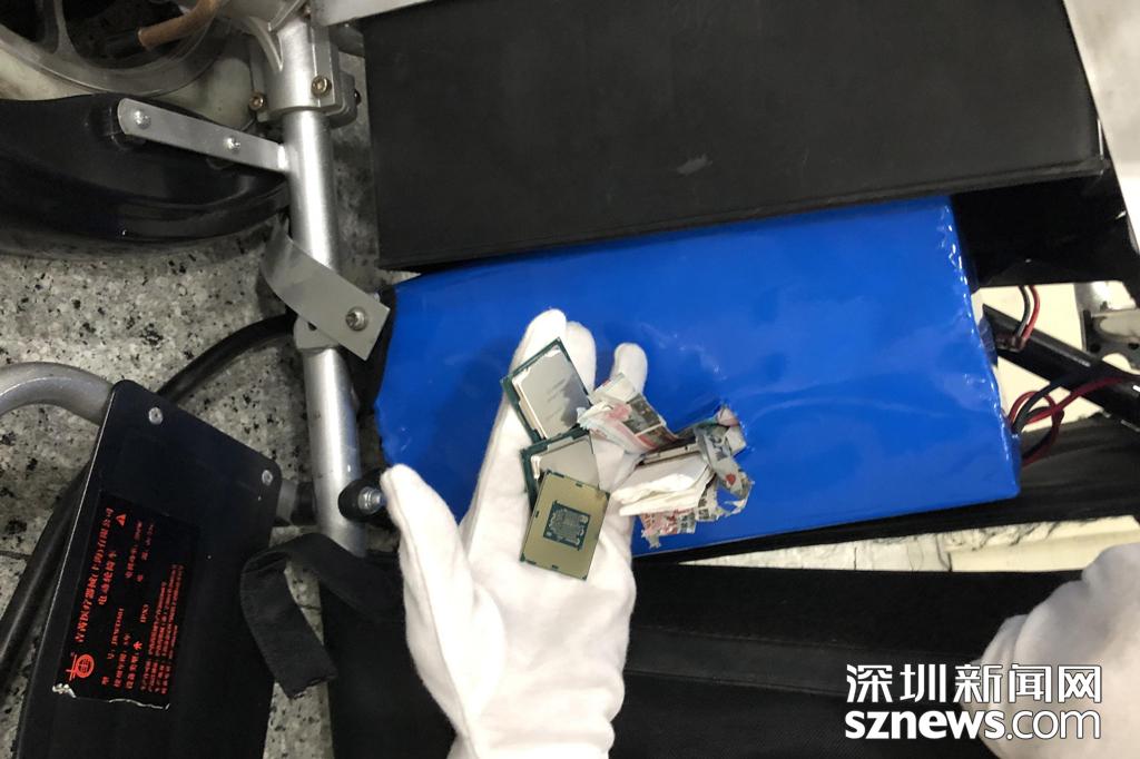 5月22日上午,在福田口岸入境大廳,一名60歲左右乘坐在電動輪椅上的女性旅客經(jīng)過海關(guān)監(jiān)管通道。據(jù)當(dāng)值關(guān)員介紹,該女子行李不多,輪椅上只有一些空背包和空袋子。隨后,海關(guān)關(guān)員對其攜帶物品及輪椅進(jìn)行檢查,發(fā)現(xiàn)輪椅底部的電池盒有異常,存在夾藏嫌疑。在拆解輪椅電池盒后,關(guān)員發(fā)現(xiàn)電池盒內(nèi)整整齊齊疊放著一批散裝CPU。經(jīng)清點(diǎn),共查獲INTEL各型號 CPU898塊。關(guān)員調(diào)查發(fā)現(xiàn),當(dāng)事人持有殘疾人證件,并承認(rèn)此次為幫人帶貨,收取了300元“帶工費(fèi)”。