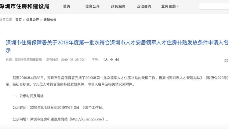 深圳商報2019年05月28日訊 市住房保障署已完成2019年第一批次領軍人才住房補貼的受理工作。經(jīng)初步核查,335位人才符合住房補貼發(fā)放條件,并對申請人名單及相關信息從5月28日起公示,接受社會監(jiān)督。