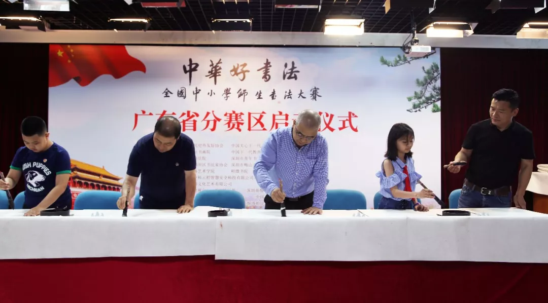 “中華好書(shū)法”全國(guó)中小學(xué)師生書(shū)法大賽廣東賽區(qū)組委會(huì)執(zhí)行副主任趙永金和教師代表趙軍、崔占海,學(xué)生代表劉子文、李唐心上臺(tái)為“中華好書(shū)法”全國(guó)中小學(xué)師生書(shū)法大賽廣東賽區(qū)比賽開(kāi)筆,在四尺斗方宣紙上寫(xiě)下了“中華好書(shū)法”五個(gè)大字,由此拉開(kāi)了“中華好書(shū)法”全國(guó)中小學(xué)師生書(shū)法大賽廣東省分賽區(qū)大賽的序幕。