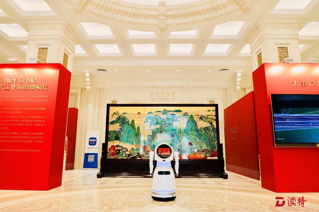 新中國成立70周年廣東省成果展入口處克魯澤提供智能迎賓服務。