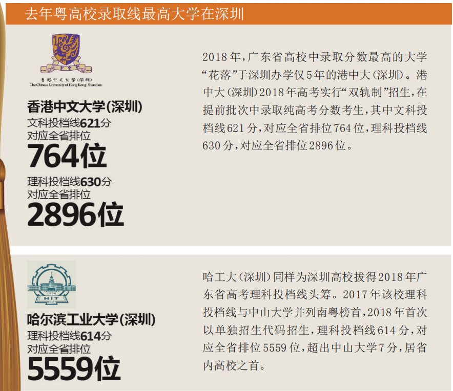 2018年,廣東省高校中錄取分?jǐn)?shù)最高的大學(xué)“花落”于深圳辦學(xué)僅5年的港中大(深圳)。港中大(深圳)2018年高考實(shí)行“雙軌制”招生,在提前批次中錄取純高考分?jǐn)?shù)考生,其中文科投檔線621分,對(duì)應(yīng)全省排位764位,理科投檔線630分,對(duì)應(yīng)全省排位2896位。