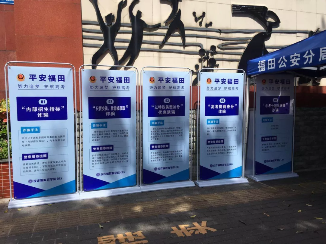 高考結(jié)束后,與高考相關(guān)的一些詐騙也進(jìn)入了活躍高峰期。福田分局制作了高考反詐騙相關(guān)展板,在全區(qū)范圍內(nèi)的6個考點出入口顯眼處擺放,提醒告誡考生及家長注意高考相關(guān)詐騙手法。