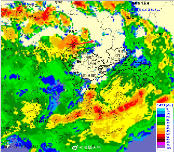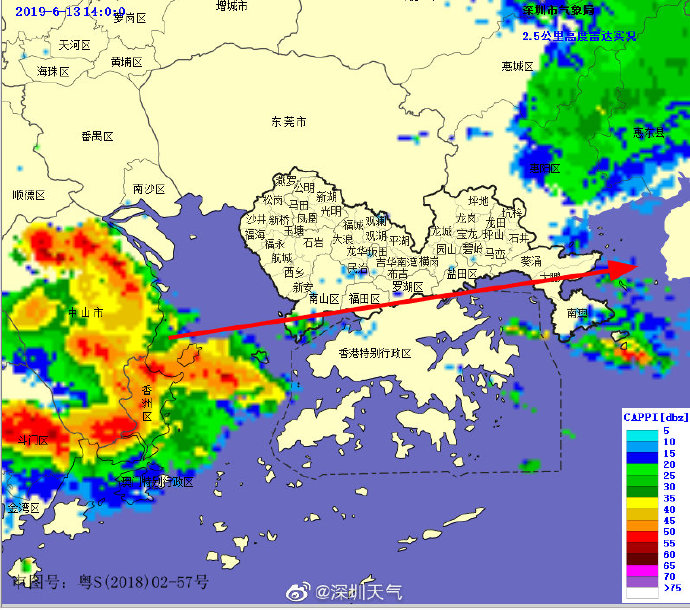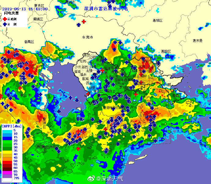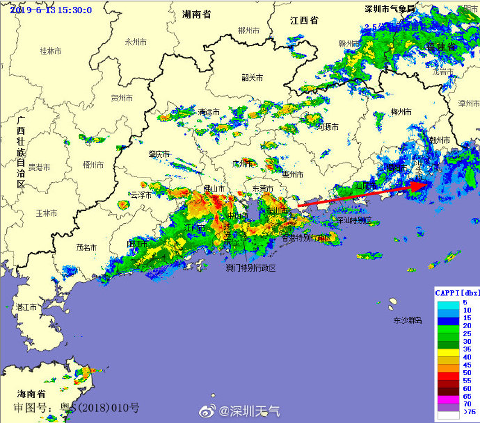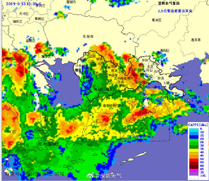 預(yù)計全市1-2小時內(nèi)將出現(xiàn)20-40毫米局部50毫米降水,深圳市氣象臺于2019年06月13日08時將暴雨黃色預(yù)警擴展至全市,全市處于暴雨戒備狀態(tài),請注意防范。
