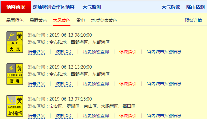 【深圳市地質(zhì)災(zāi)害氣象風(fēng)險預(yù)警2019年第17號】根據(jù)目前降雨情況,結(jié)合我市地質(zhì)環(huán)境條件,現(xiàn)對全市陸地發(fā)布地質(zhì)災(zāi)害氣象風(fēng)險黃色預(yù)警,氣象因素致上述地區(qū)發(fā)生地質(zhì)災(zāi)害的風(fēng)險較高,請相關(guān)部門和單位做好地質(zhì)災(zāi)害各項防御工作。