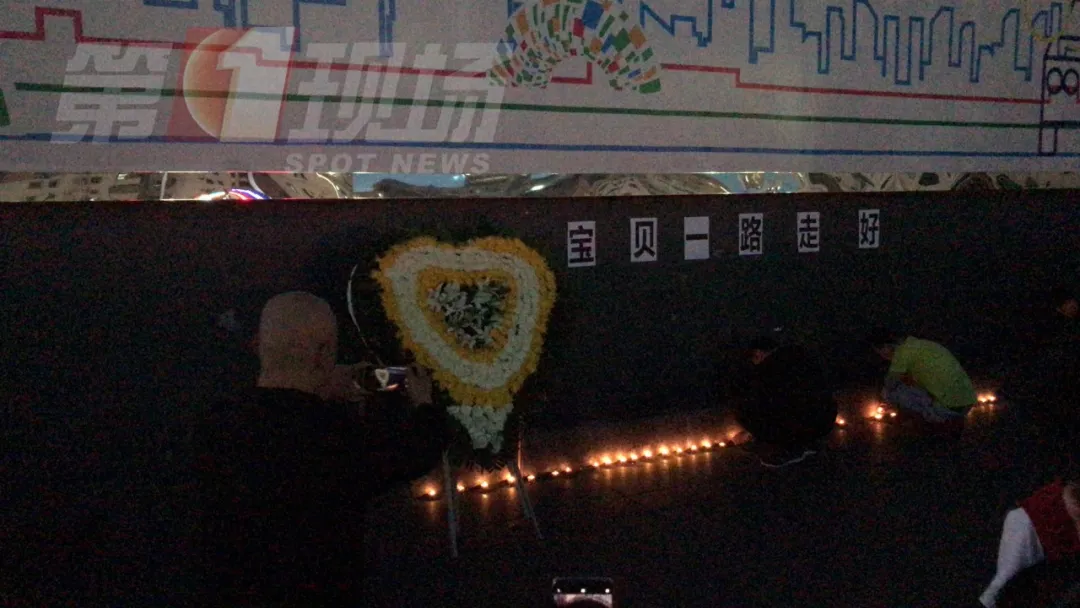 在廣場正中央,放立著一個心形花牌,大家在地上點(diǎn)上了蠟燭,墻面貼著“寶貝一路走好”。
