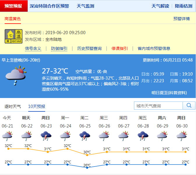市氣象臺預(yù)測,深圳6月22日多云炎熱,有短時雷陣雨,最高氣溫32~34℃;23日-24日多云間陰天,有雷陣雨。