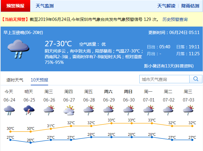 深圳新聞網(wǎng)2019年6月24日訊 今天白天,全市陰天有陣雨或雷陣雨,局地暴雨。最低氣溫27℃,最高氣溫31℃。本次降雨局地性明顯、短時(shí)雨較強(qiáng)、伴短時(shí)大風(fēng)。