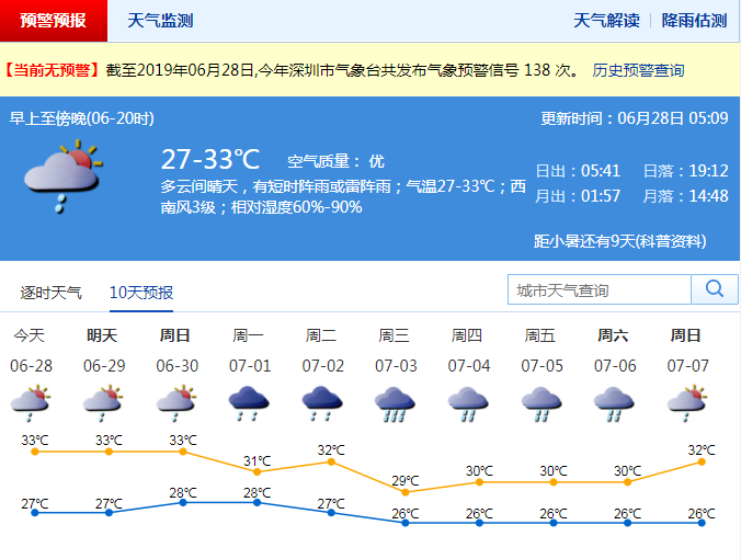 深圳新聞網2019年6月28日訊 市氣象局預計28日多云間晴天,有短時(雷)陣雨,局部地區(qū)雨勢較大,降雨易出現(xiàn)在早晨和午后時段;氣溫27-33℃,天氣炎熱;西南風緩和,沿海和高地最大陣風可達6-7級;相對濕度60%-90%,雨后濕度增大,體感悶熱。29-30日與28日天氣較為相似,天氣炎熱,有短時(雷)陣雨,局部地區(qū)雨勢較大;展望7月1-2日陣雨增多。