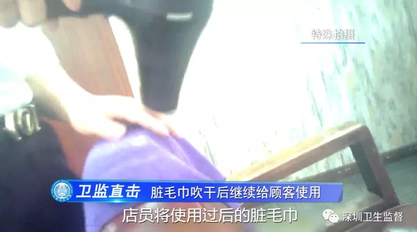 更讓人無法接受的是,當(dāng)干凈毛巾不夠用的時候,店員將使用過后的臟毛巾,未經(jīng)過清洗消毒,就用吹風(fēng)機(jī)吹干后,重新放回干凈毛巾取用架內(nèi),繼續(xù)直接給顧客洗頭、擦臉用。