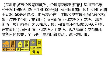 于14時(shí)40分起先后在寶安區(qū)、龍華區(qū)、南山區(qū)、福田區(qū)和龍崗區(qū)(南灣、坂田、平湖、布吉、吉華街道)發(fā)布暴雨黃色預(yù)警,在龍崗區(qū)(坂田街道)和龍華區(qū)(龍華、觀湖街道)將暴雨黃色升級(jí)為暴雨橙色預(yù)警。