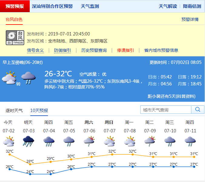 深圳新聞網(wǎng)2019年07月02日訊 深圳市氣象臺已于昨日20時45分發(fā)布臺風白色預警信號,預計其將可能在48小時內(nèi)影響我市,全市進入臺風注意狀態(tài)。氣象臺預計,今日白天深圳風力逐漸加大,最大陣風7級左右,午后降雨漸趨頻密,局部大雨,夜間降雨加大,有大雨到暴雨,局部大暴雨,請做好防范準備!