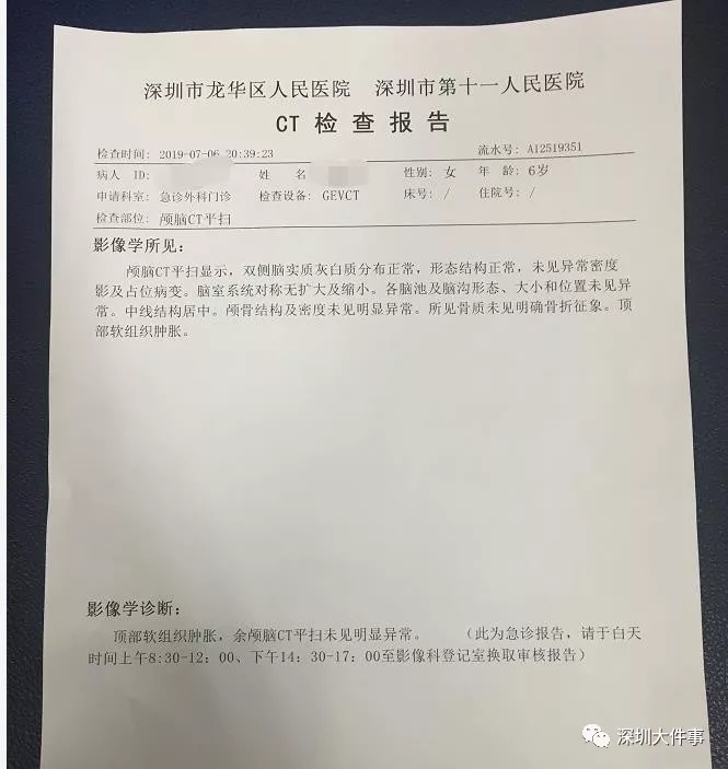 據(jù)市民李女士報(bào)料稱,7月6日晚上8時(shí)許,在龍華區(qū)弓村一巷一位6歲女童被樓上掉下的瓶子砸中頭部,血流不止。隨后女童被父母送往附近社康醫(yī)治,但因傷口太深社康無(wú)法治療,遂被送往龍華人民醫(yī)院救治。
